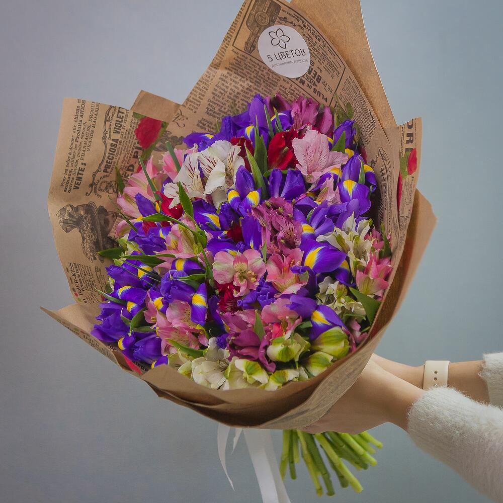 Букет из 20 ирисов и 15 альстромерий
