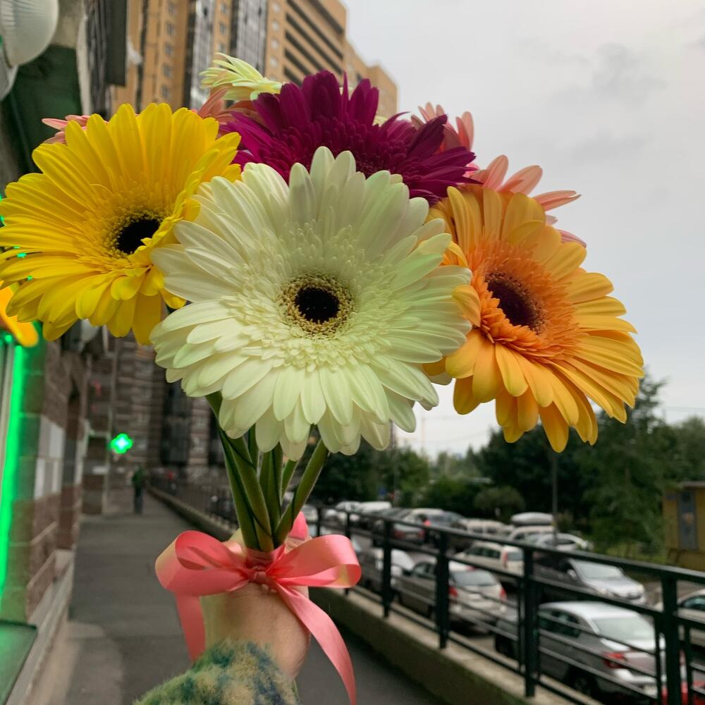 герберы микс – 7 шт.Лента атласная – 1 шт.флористическая проволока – 7 шт.