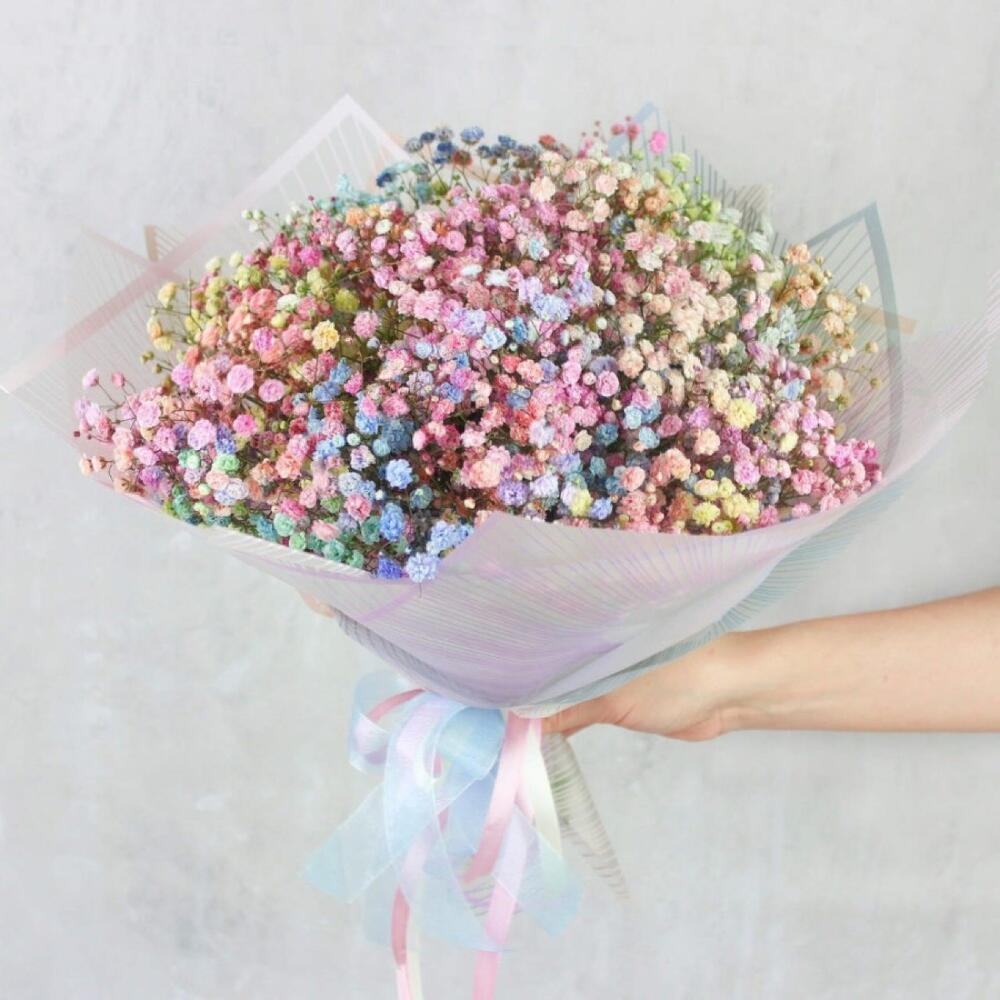 Гипсофила – 35 шт. Упаковка дизайнерская – 2 шт. Открыточка с вашими пожеланиями – 1 шт. инструкция по уходу за цветами – 1 шт.
