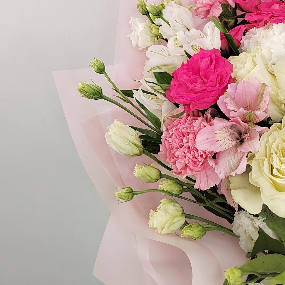 Альстромерия – 7 шт.Салал – 15 шт.Лента атласная – 10 шт.Роза кустовая пионовидная – 2 шт.Гвоздика сортовая – 7 шт.Упаковка дизайнерская – 8 шт.эустома белая – 5 шт.Роза одноголовая эквадор – 7 шт.