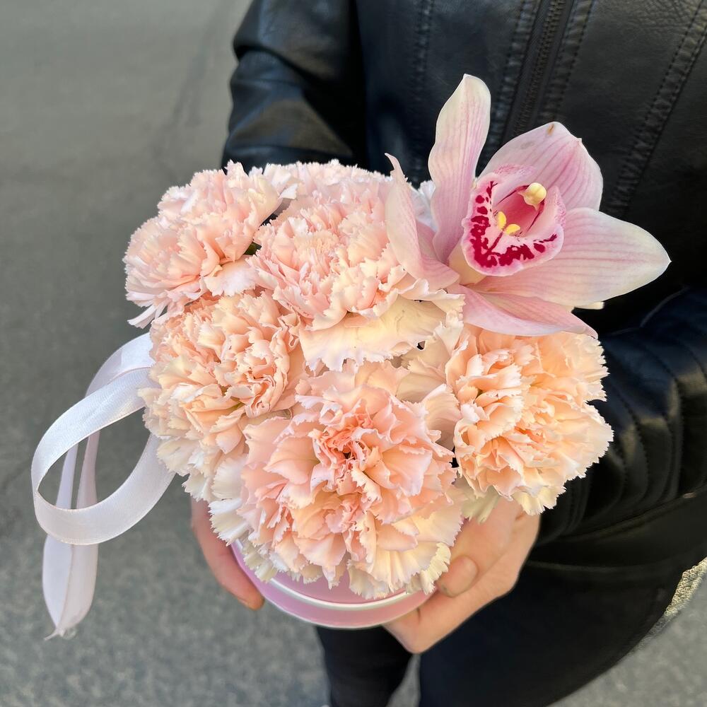 Орхидея Цимбидиум белая – 1 шт.Диантус кремовый – 7 шт.Оазис флористический – 1 шт.удлинитель для орхидеи – 1 шт.Лента атласная нежно-розовая – 1 шт.шляпная коробочка мини – 1 шт.