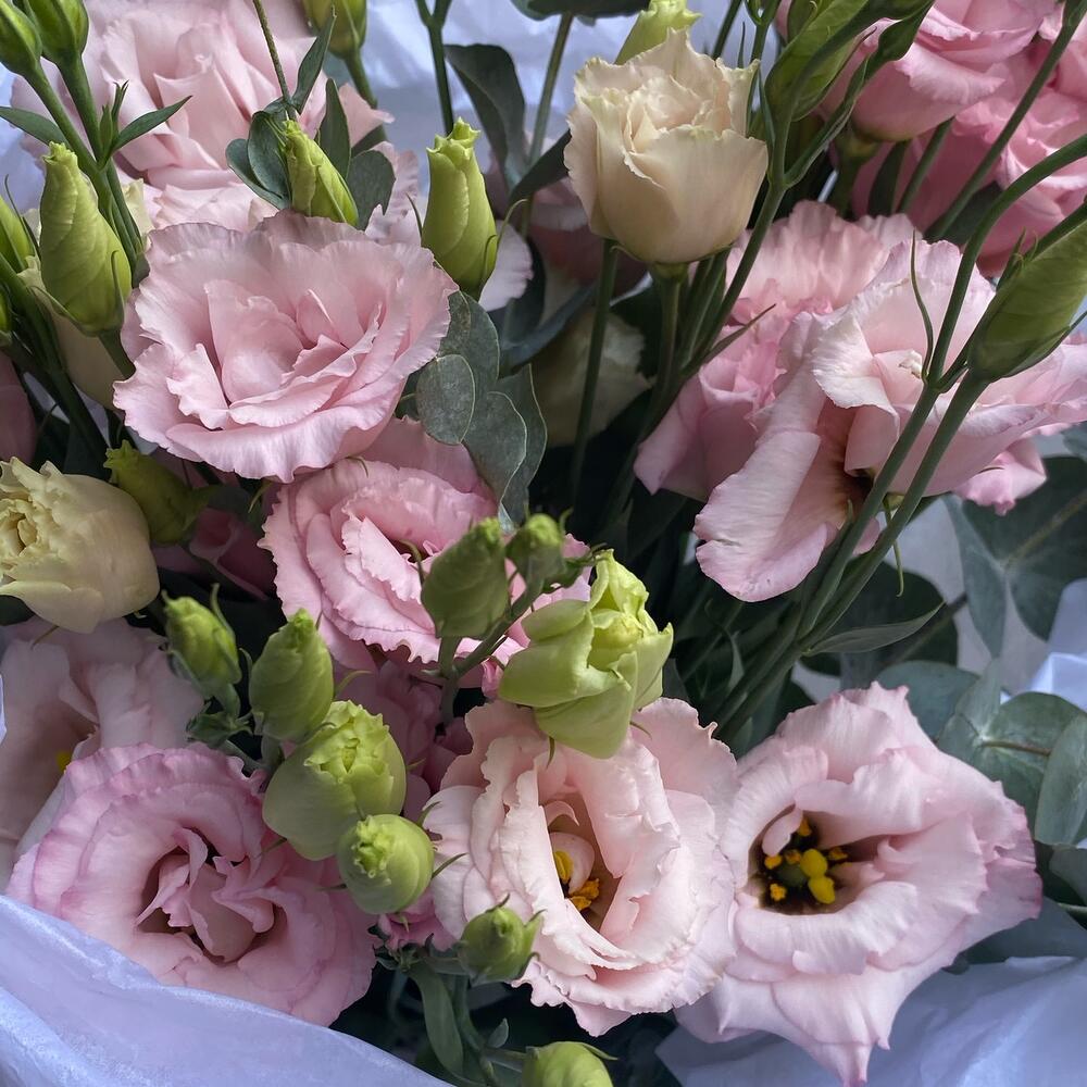 Лизиантус махровый розовый – 7 шт.Эвкалипт – 2 шт.Тишью – 2 шт.Упаковка дизайнерская – 4 шт.лента атласная брендированная красная – 1 шт.