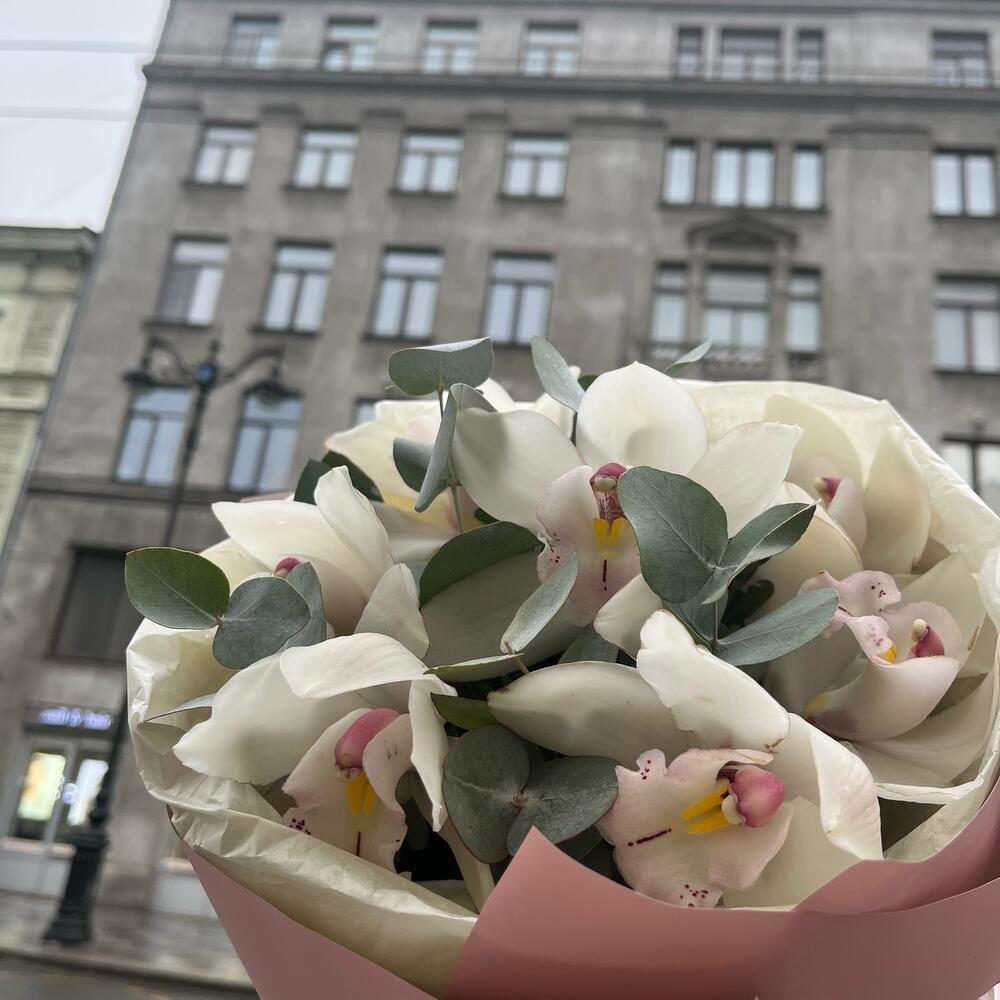Эвкалипт – 4 шт.Лента атласная – 1 шт.Тишью – 1 шт.удлинитель для орхидеи – 7 шт.Упаковка корейская пленка – 1 шт.премиум орхидея цимбидиум – 7 шт.