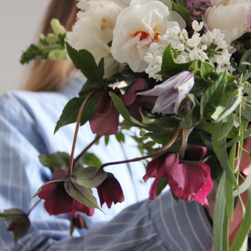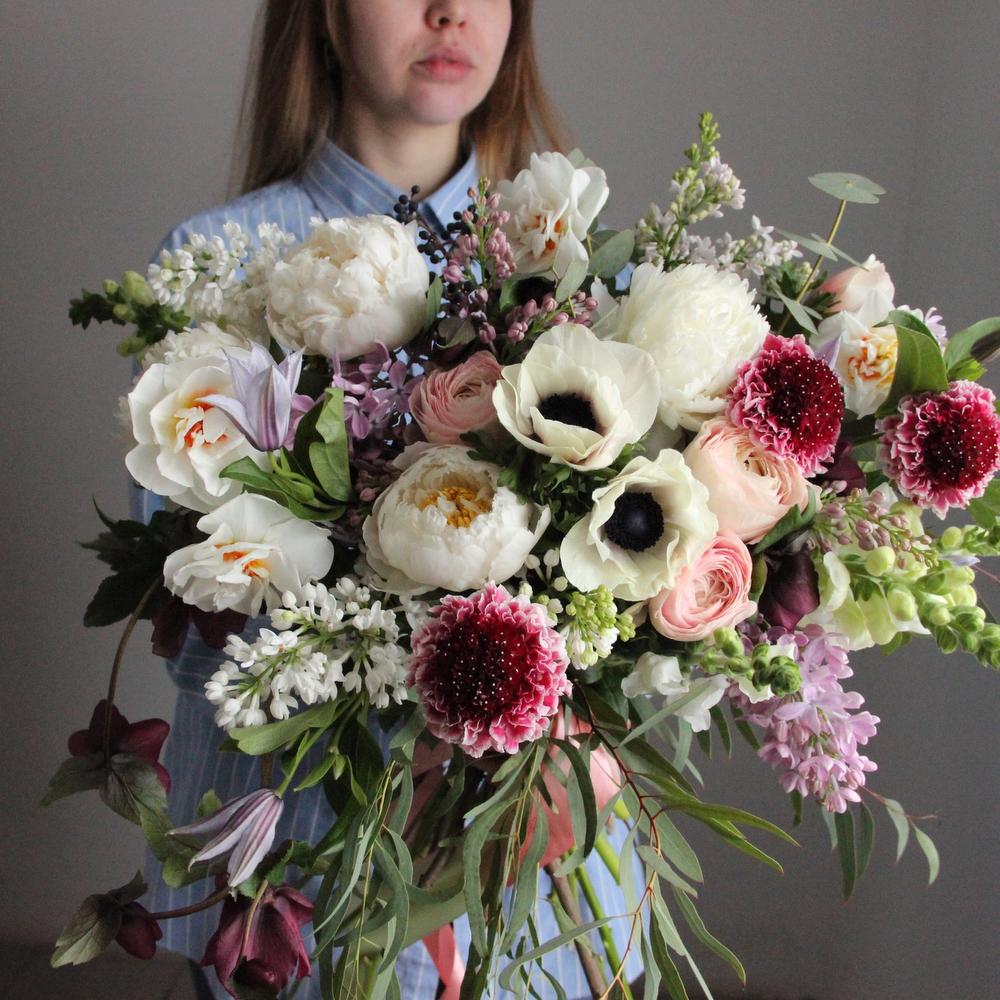 Анемон – 3 шт.Нарцисс – 3 шт.Пион – 3 шт.Сирень – 4 шт.Скабиоза – 3 шт.Эвкалипт – 5 шт.Лента атласная – 1 шт.Фисташка – 3 шт.Ранункулюс – 3 шт.Клематис – 2 шт.Львиный зев – 2 шт.Хелеборус – 2 шт.