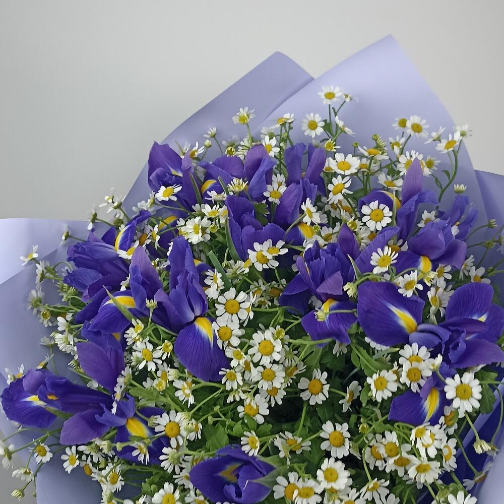 Матрикария (ромашка) – 19 шт.Ирис Blue Magic – 10 шт.Пленка матовая – 2 шт.Лента – 1 шт.