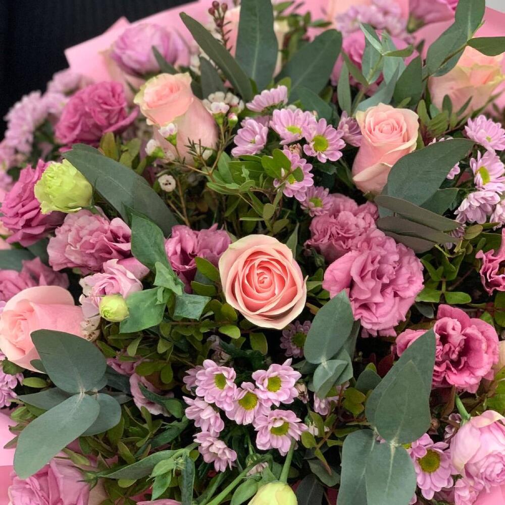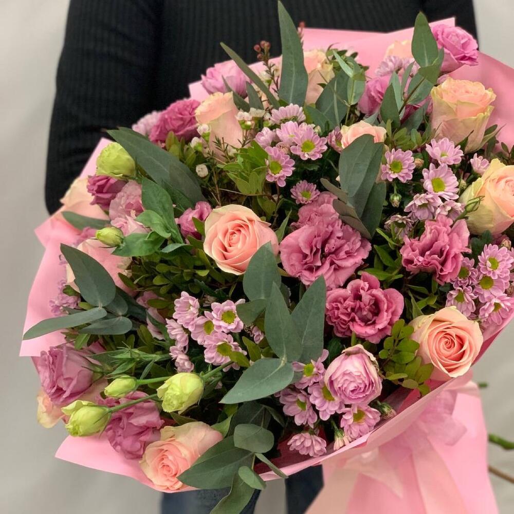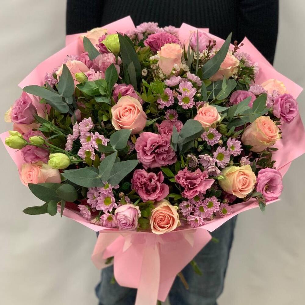 Роза Эквадор – 11 шт.Сантини – 8 шт.Лизиантус – 6 шт.Ваксфлауэр – 2 шт.Фисташка – 5 шт.Эвкалипт – 3 шт.Упаковка дизайнерская – 3 шт.Лента атласная – 1 шт.