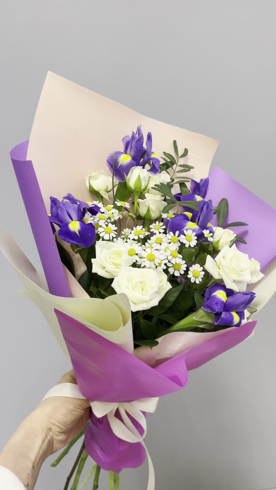 Роза – 3 шт.Ирис – 5 шт.Матрикария – 1 шт.Фисташка – 1 шт.Упаковка дизайнерская – 1 шт.