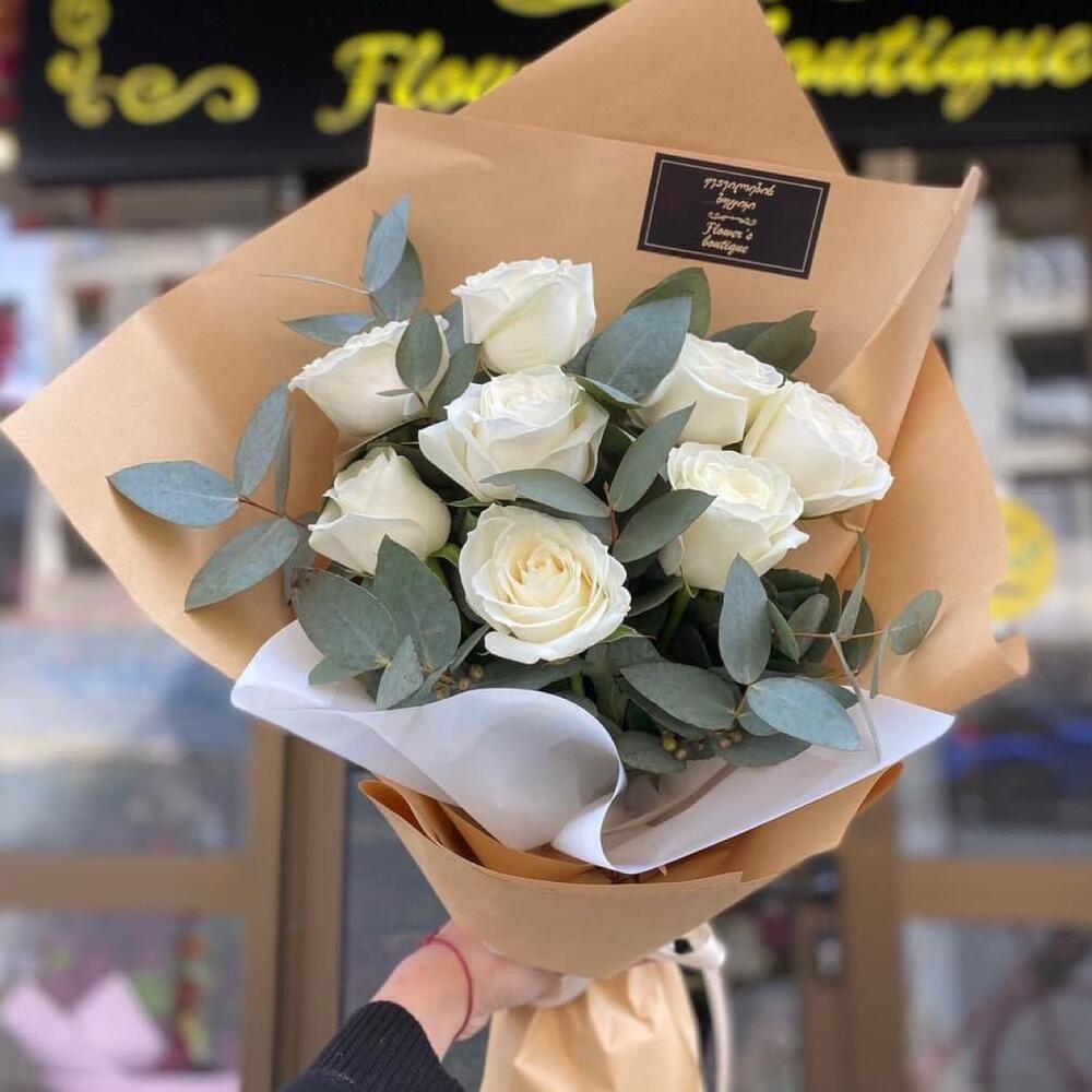 Шикарный букет из белых роз с эвкалиптом в шикарной упаковке