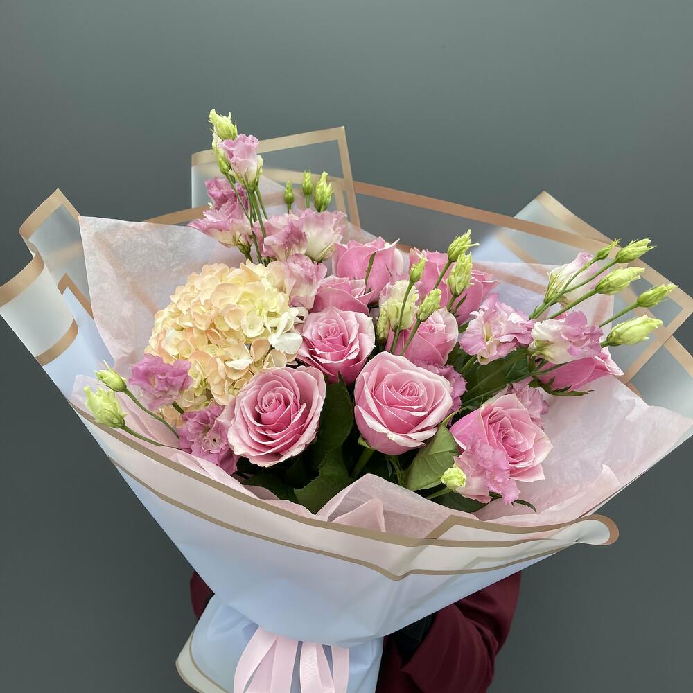 Альстромерии, Гортензии, Кустовые розы, Лизиантусы, Розы, Хризантемы