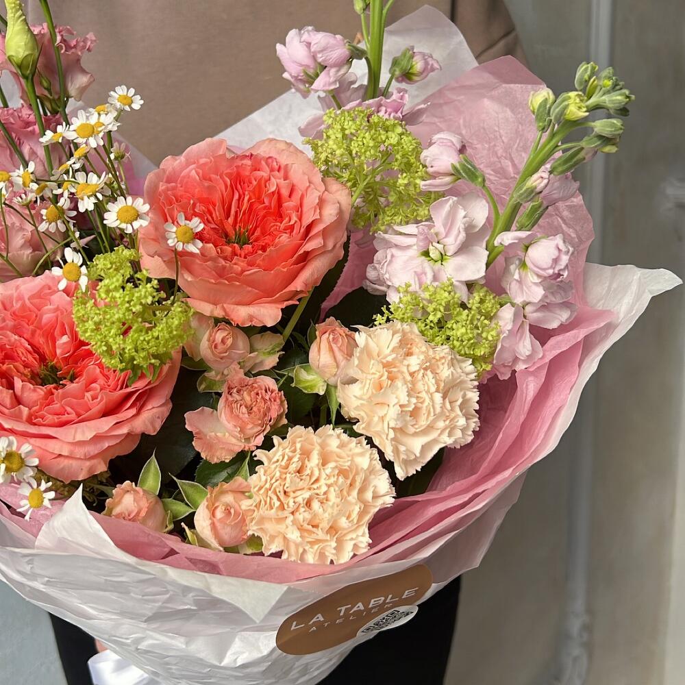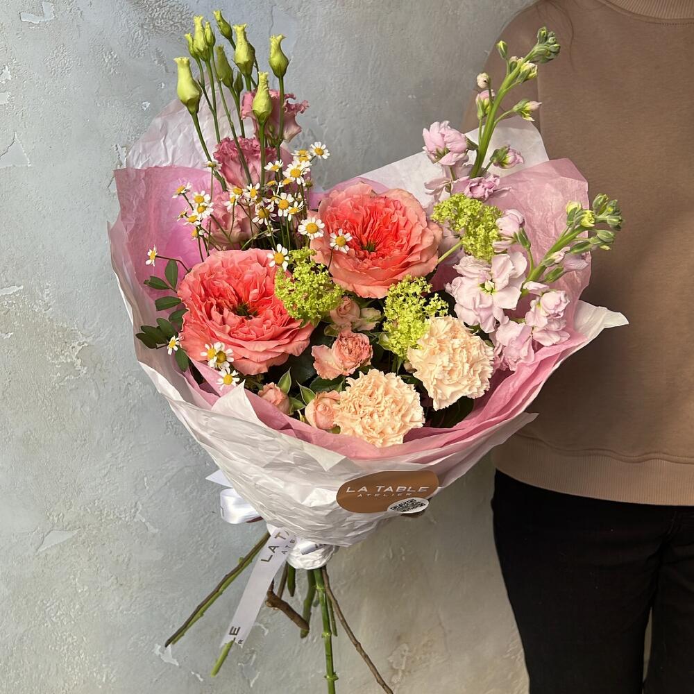 Роза пионовидная – 2 шт.Диантус – 2 шт.Роза кустовая пионовидная – 1 шт.Лизиантус – 1 шт.Маттиола – 2 шт.Матрикария – 1 шт.Упаковка дизайнерская – 1 шт.