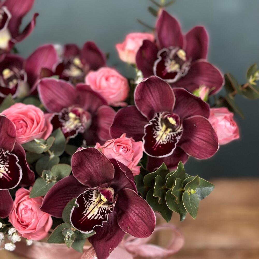 Композиция с орхидеей Цимбидиум, кустовыми розами и эвкалиптом