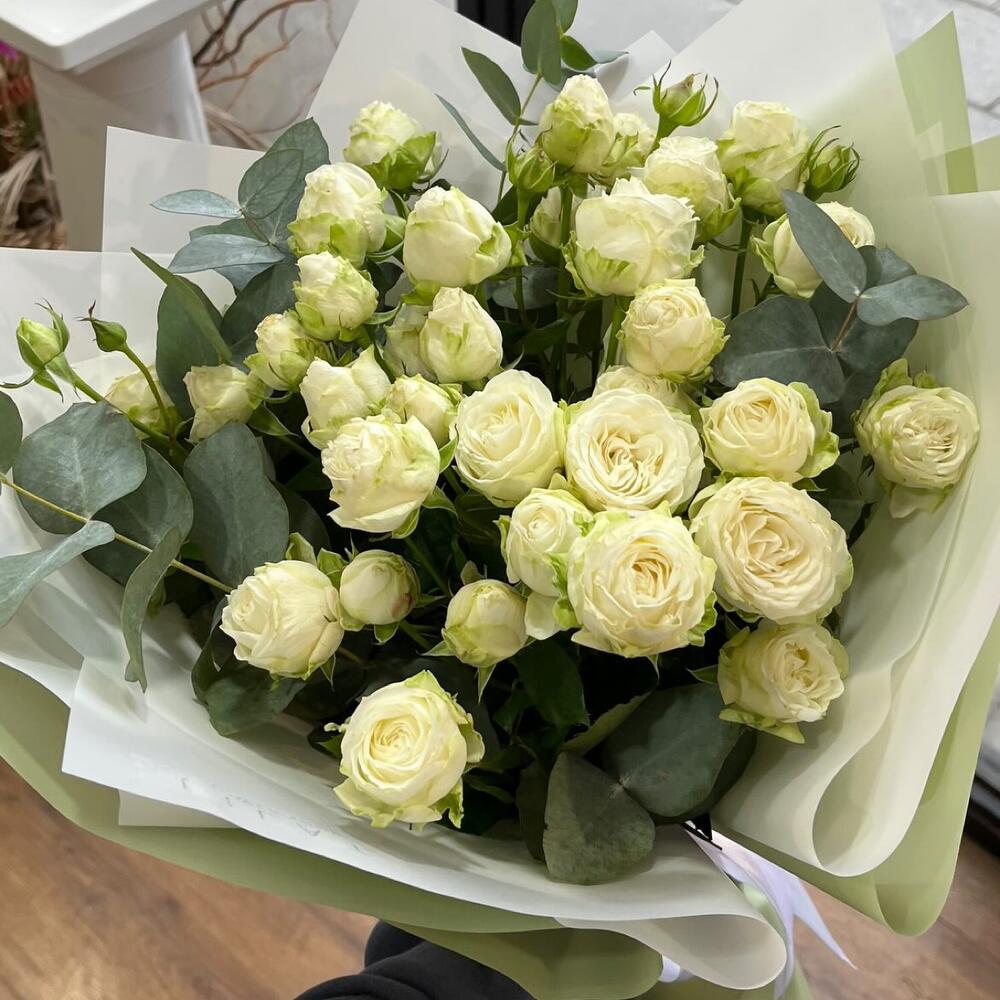Пионовидная кустовая роза – 11 шт. Эвкалипт – 5 шт. Упаковка дизайнерская – 2 шт. Открыточка с вашими пожеланиями – 1 шт. инструкция по уходу за цветами – 1 шт.